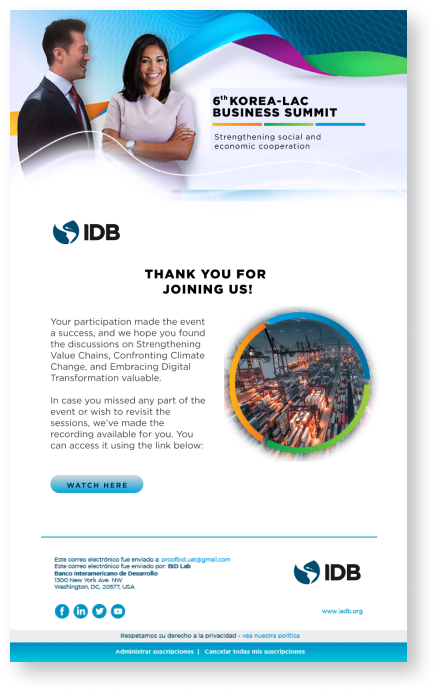 The goal is to create a communication strategy that ensures consistent design, effectively disseminates event information, and engages the audience. This strategy will promote the Inter-American Bank’s key messages, drive participation, and position the event as a vital platform for industry collaboration.